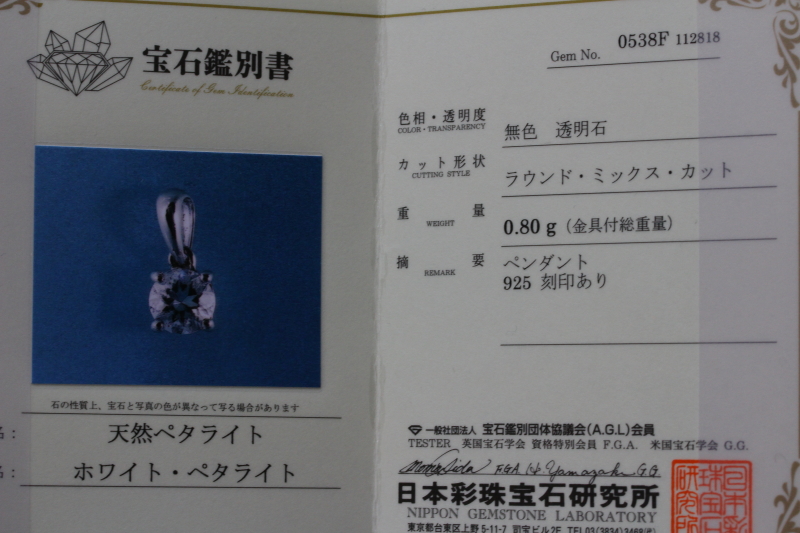 日本彩珠宝石研究所の鑑別書付きです。