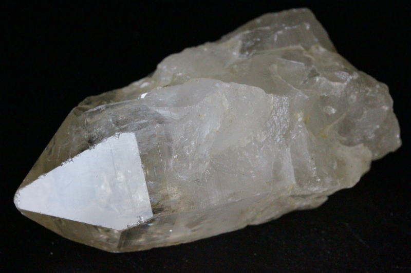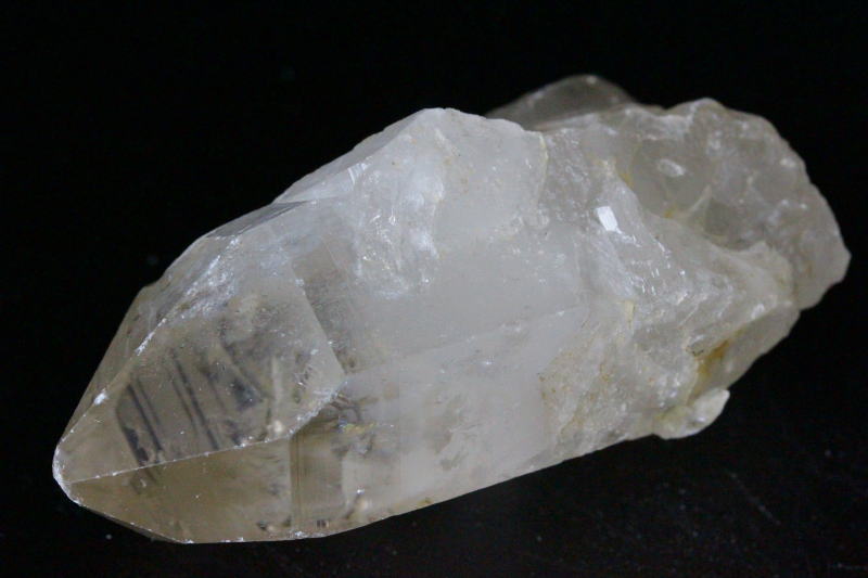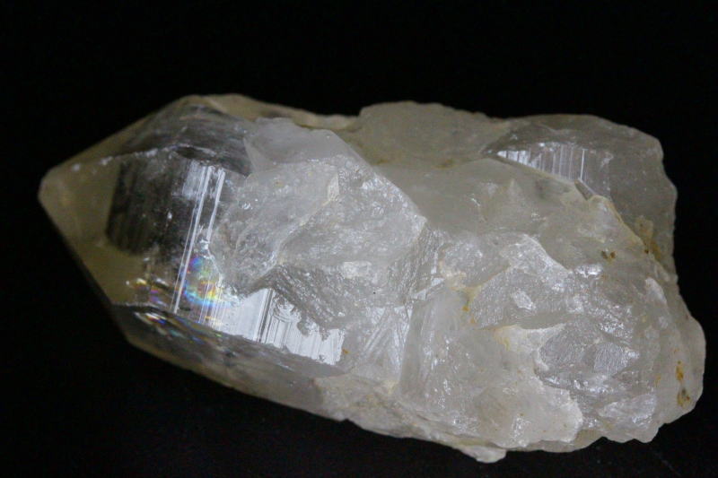 水晶本体は曇りガラス状の黄色っぽく、幾度も起きた地殻変動を受けて成長してきたので形が整っているものが非常に少ないです。