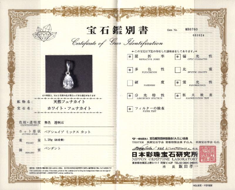 極上宝石!超高波動ロシア産フェナカイト・ペンダント鑑別書付きが入荷しました。