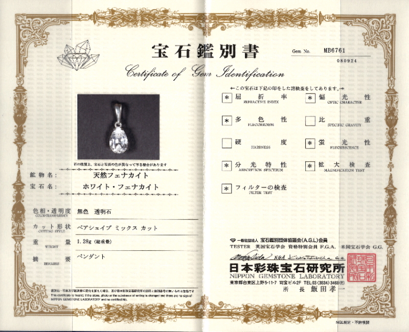 極上宝石!超高波動ロシア産フェナカイト・ペンダント鑑別書付きが入荷しました。