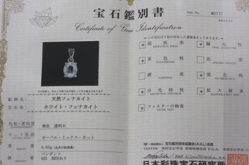 激レア!ロシア産フェナカイ1.05ct・ペンダント鑑別書付きが入荷しました。