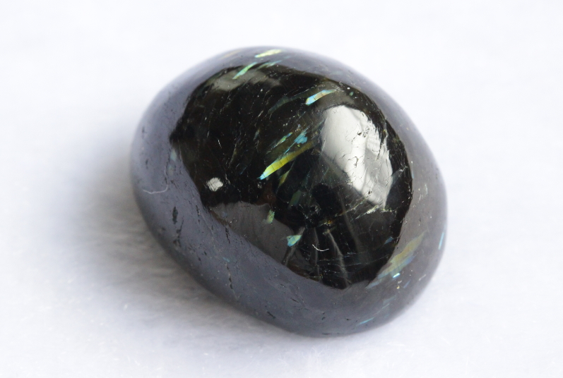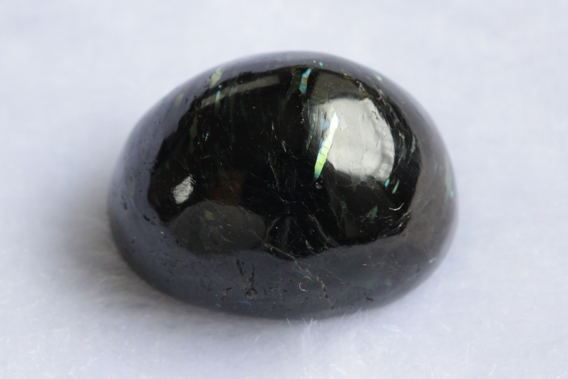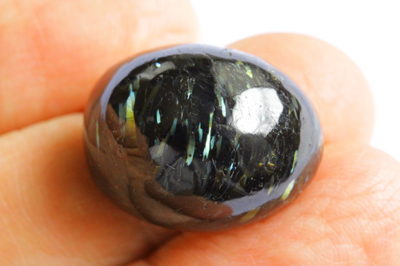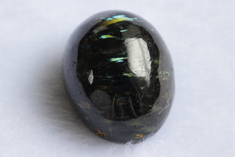 一見すると真っ黒にも見えますが、光の角度によってゴールド、ブルー、グリーンなどの独特の輝きが見られます。