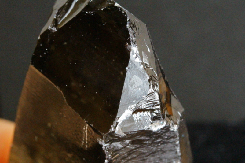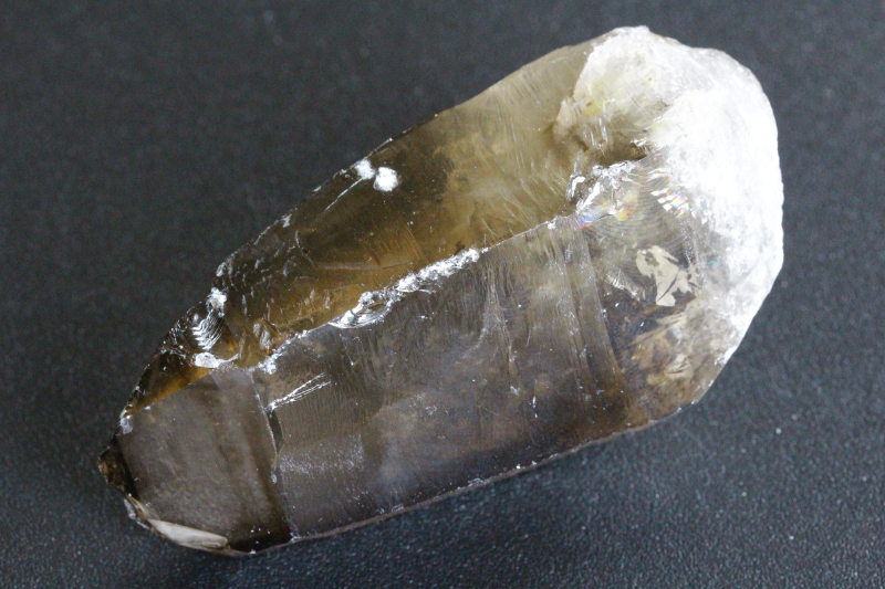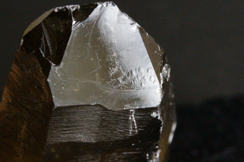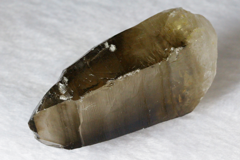 水晶本体は曇りガラス状の黄色っぽく、幾度も起きた地殻変動を受けて成長してきたので形が整っているものが非常に少ないです。