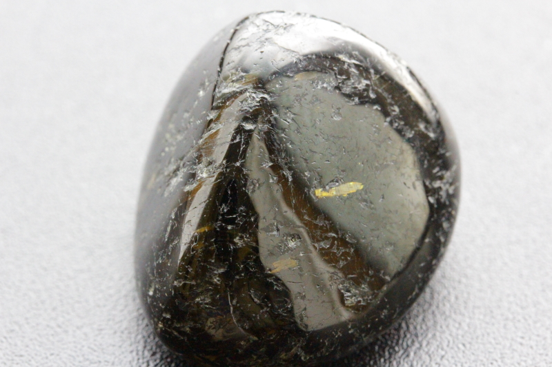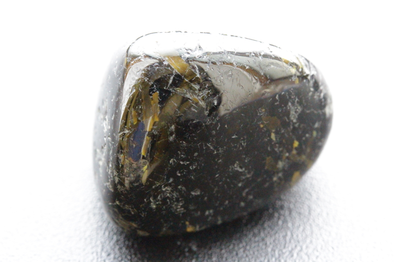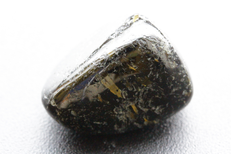 一見すると真っ黒にも見えますが、光の角度によってゴールド、ブルー、グリーンなどの独特の輝きが見られます。