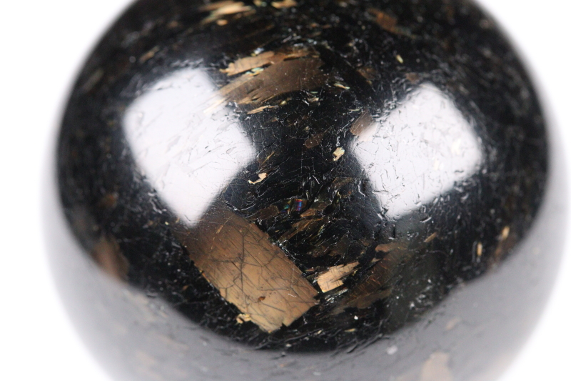 深い黒色の中に金色や銀色、虹色のイリデッセンス(虹彩効果)が閃光のように輝き、まるで宇宙の始まりや古代の神秘を封じ込めたような荘厳な美しさを持ちます。